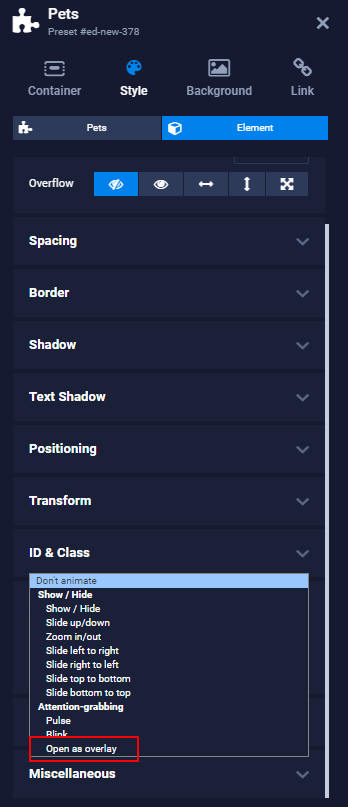 Aquí tienes diferentes maneras de animar este contenedor. Como queremos que este adorable cachorro se abra como superposición, cuando un visitante acceda al sitio web, seleccionamos “Abrir como superposición”.