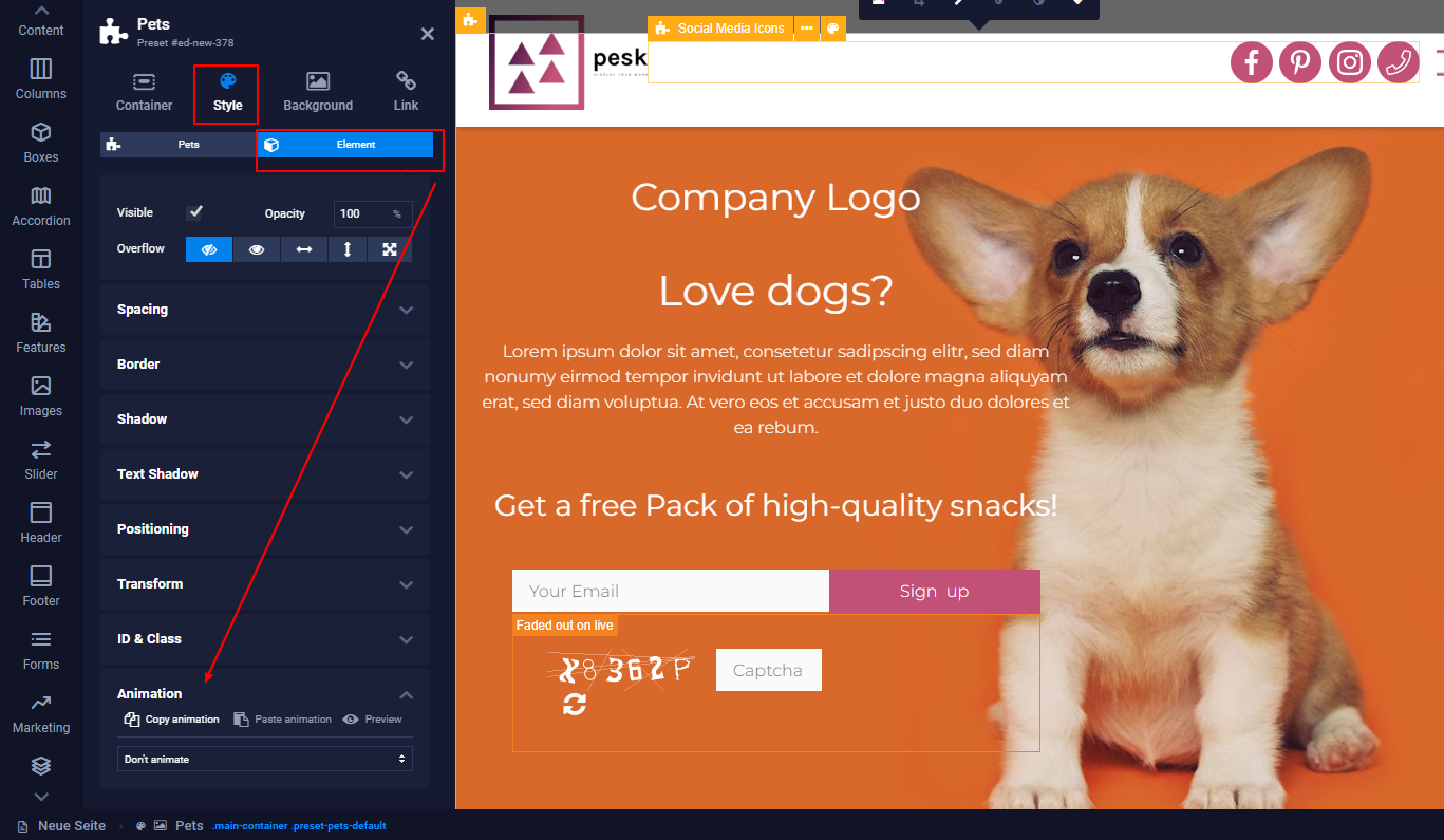 Puedes agregar estos elementos con ajustes predefinidos en cualquier parte de tu sitio web. Sin embargo, para una mejor visión general, recomendamos colocarlos al final de la página. Elijamos la superposición del adorable cachorro. Arrastra y suelta este ajuste predefinido en tu sitio web y accede directamente a las animaciones.