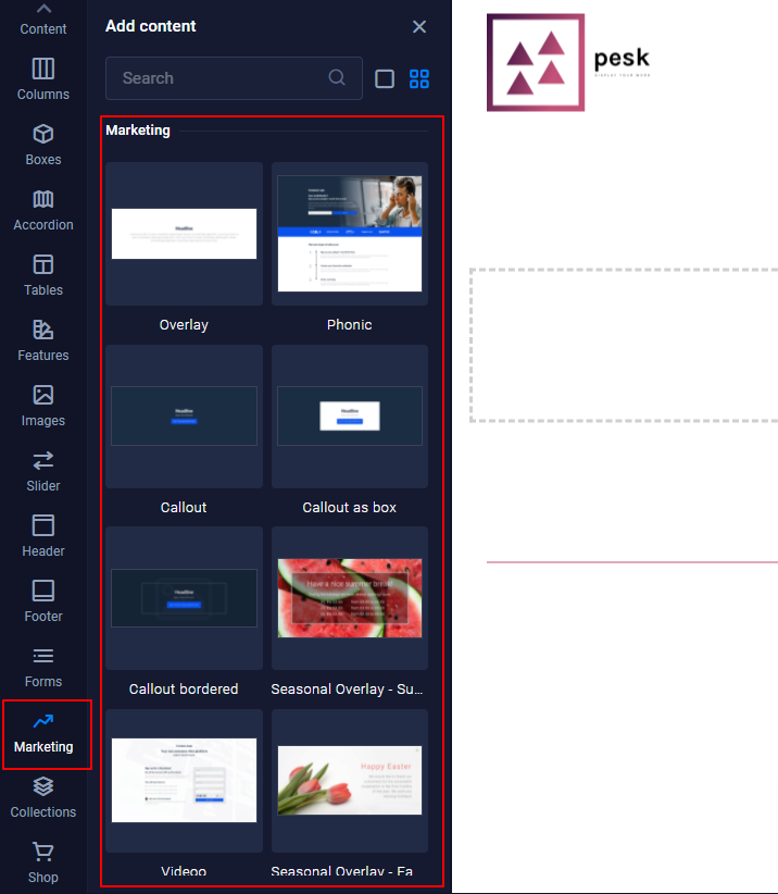 Sitejet ofrece una variedad de animaciones útiles, fáciles de conseguir y muy fiables. Entre ellas, se encuentra la opción “Superposición”, disponible en la configuración de cada elemento. También hay superposiciones predefinidas que puedes usar y personalizar según tus necesidades. Para encontrarlas, haz clic en “Marketing” en el panel izquierdo del Creador de Sitios Web.