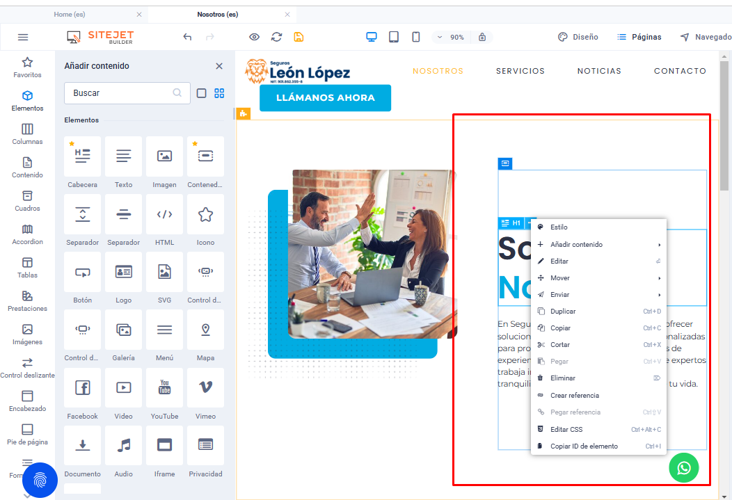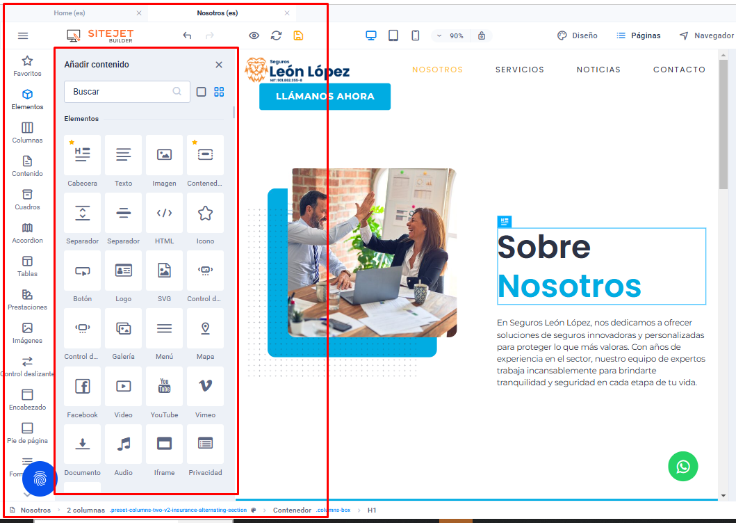 Elementos: Son componentes individuales como titulares, textos o imágenes. Estos se representan con íconos en la barra lateral.