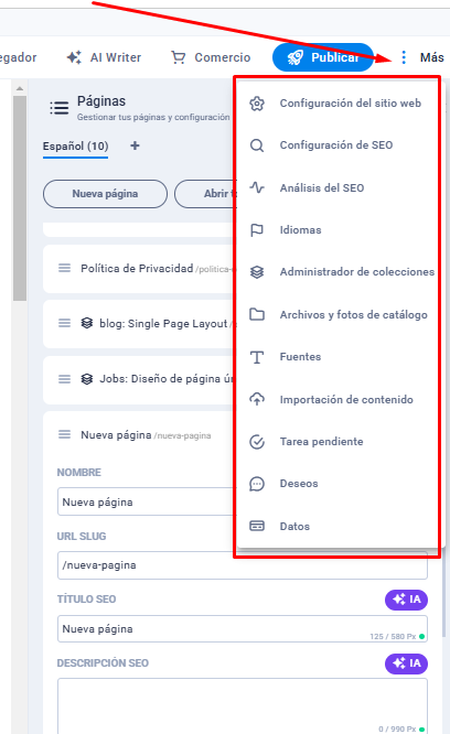 El menú Más en el editor de sitios web de Sitejet ofrece funciones adicionales útiles para la gestión y personalización de tu sitio web. A continuación, se detallan estas funciones: