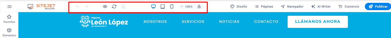 En el pie de página del editor de Sitejet, encontrarás varias herramientas útiles que facilitan la navegación y edición de tu sitio web: