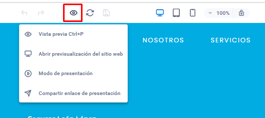 Al hacer clic en el ícono de ojo (o usar Ctrl + P) puedes previsualizar tu sitio web dentro del editor; por eso lo llamamos el ícono de vista previa. Esta función te permite verificar y probar cambios que aún no han sido guardados. Si pasas el cursor sobre el ícono de vista previa, verás un menú desplegable con opciones adicionales: