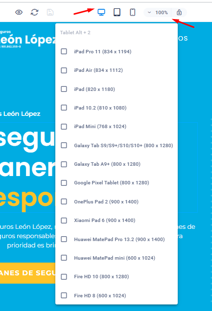 Si pasas el cursor sobre una vista, encontrarás diferentes dispositivos predefinidos para verificar tu sitio en diferentes resoluciones. Usando el menú desplegable de porcentaje, también puedes determinar qué factor de zoom se debe usar y, si deseas fijar el factor de zoom, puedes hacerlo haciendo clic en el candado; de lo contrario, el zoom se ajustará según el dispositivo elegido.