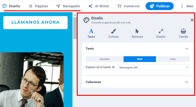 Bajo Diseño, encontrarás todas las configuraciones globales del sitio web, como el esquema de colores, fuentes y diseño de botones, que afectarán a todo el sitio y garantizarán un estilo y diseño consistentes, incluso si decides cambiarlos más adelante. Puedes sobrescribir estas configuraciones de diseño en los paneles de configuración de los elementos y preajustes individuales.